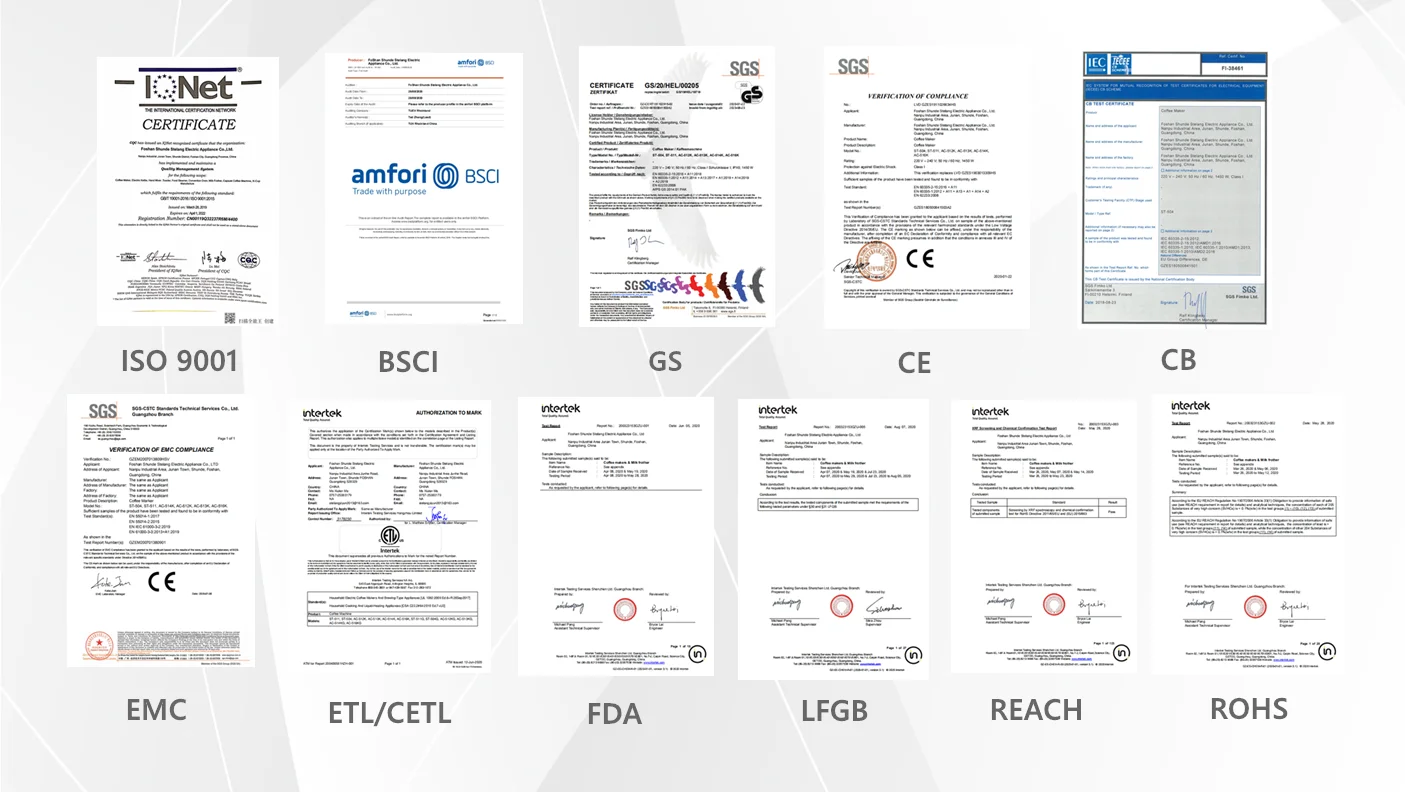 - Obtained ISO9001, BSCI, GS, CE, CB, CCC, ETL, CETL, LFGB, ROHS, REACH, EMC, SASO certificates.