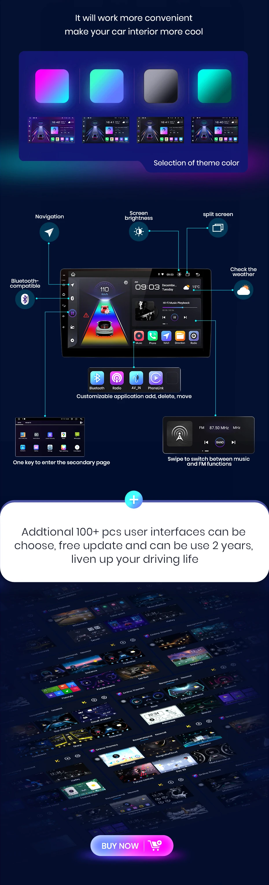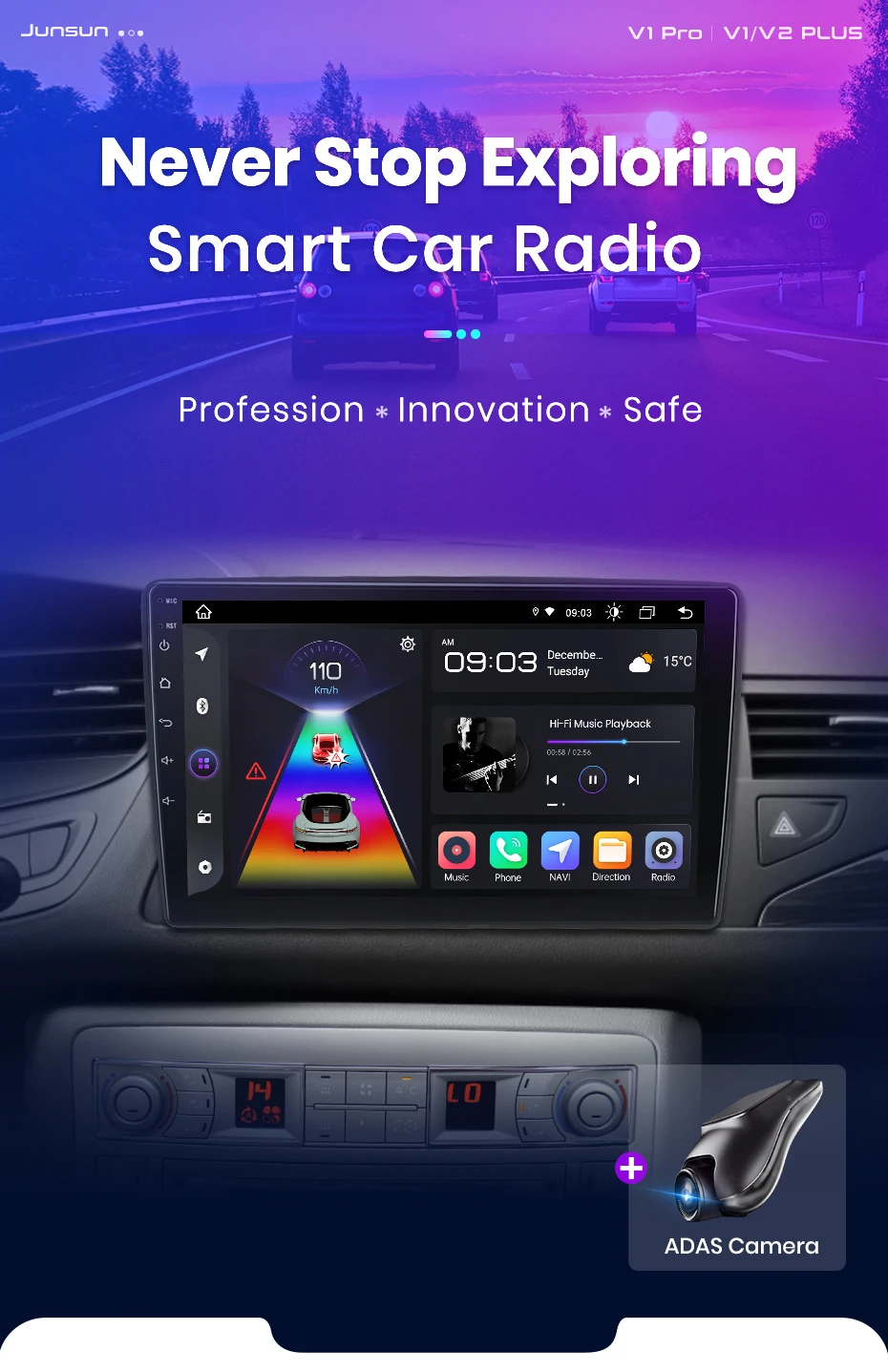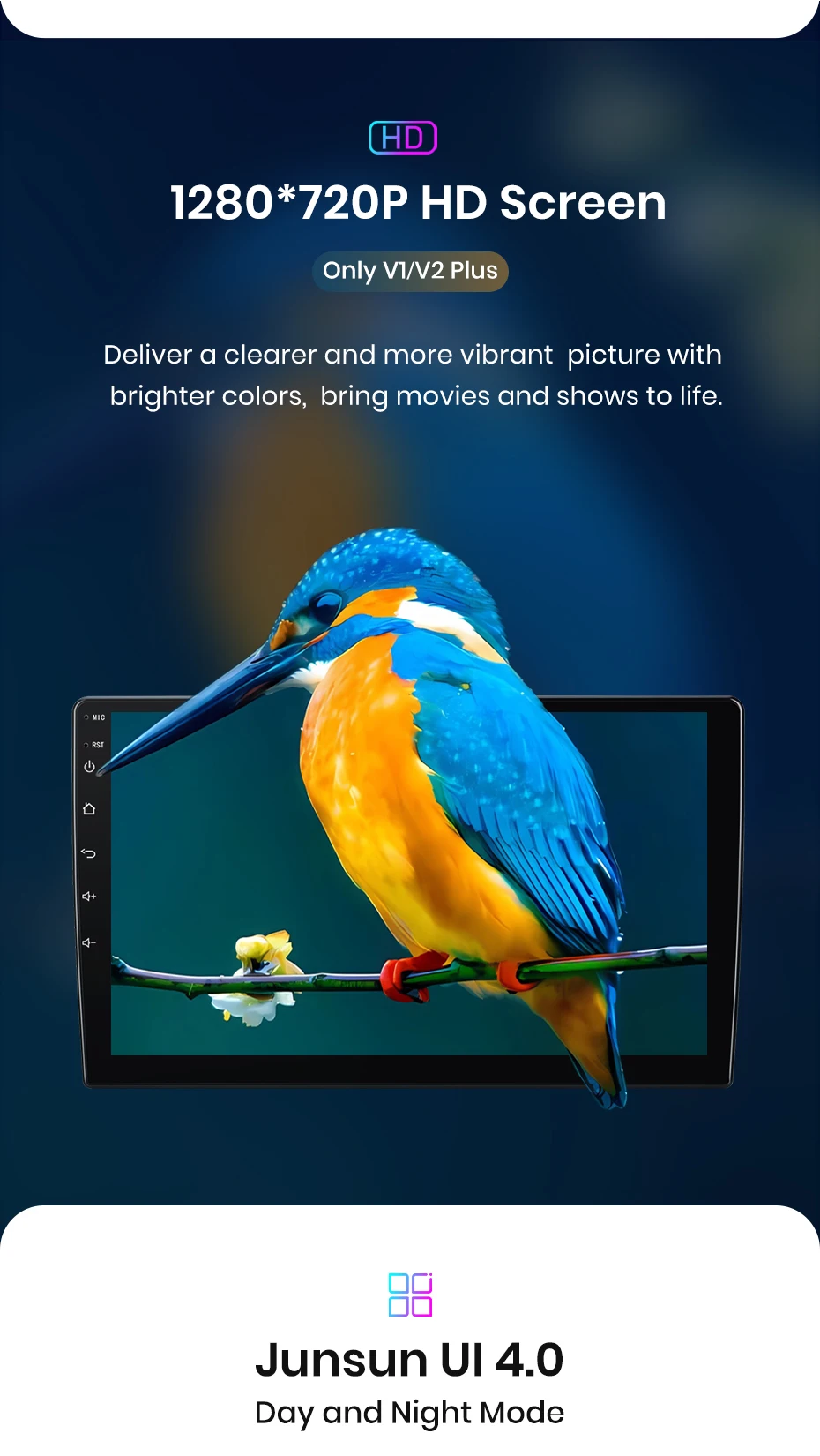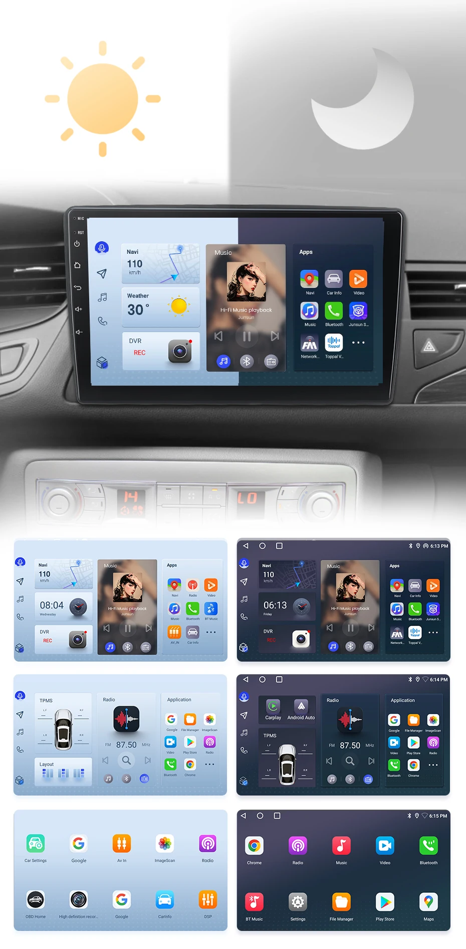 >>The radio will switch between day and night modes using car headlights to adjust the overall brightness of the screen to match the surrounding environment. Common functions are integrated into the desktop, enabling you to switch between navigation, music, Bluetoo-th calls, and other common features with just one click. Junsun's personalized UI design enhances convenience and safety throughout your journey;